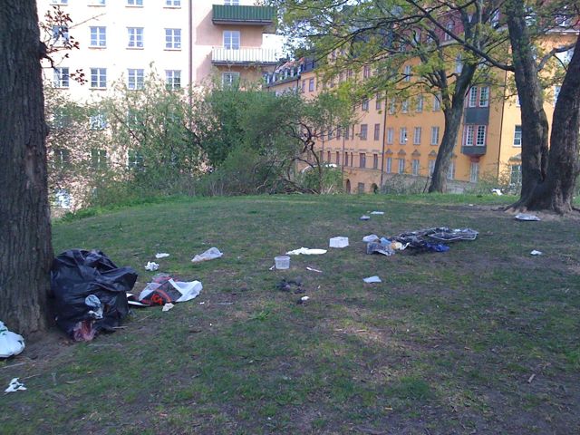Pest eller kolera till stockholmare och annat löst folk som tycker det är ok att lämna sitt picknick-skräp efter sig? Jag röstar för pest. Jätteroligt att folk från alla stadsdelar och kvarter uppskattar vår park, mindre roligt att idioterna inte fattar att den ska gå att använda nästa dag också. Vem har de tänkt ska städa upp efter dem? Mitt uppe i en finanskris tycker nedskräparna uppenbarligen att Stockholms stad inte har nån bättre användning för våra pengar. Lata jävlar.