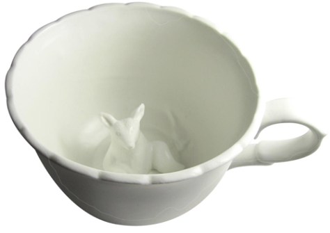 Den här muggen skulle jag vilja dricka mitt kaffe ur. Vilken trevlig överraskning när man är färdig. Eller är det läskigt att veta att det sitter en liten räv där nere och väntar? Hittade den via Creature Comforts häromdagen, och blev påmind om Ernst Billgrens serie New Friends för Kosta Boda som kom för ett par år sen. Han har också en räv med. Fast min favorit är nog kannan med anden. Eller tumblerglaset med björnen! Som ser mer ut som en utter.