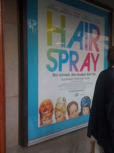 Anyways, tills dess får ni hålla till godo med en liten statusuppdatering från undertecknad. Om en kvart börjar en förhandsvisning av musikalen Hairspray som jag och mamma kommer att titta på. Rolf Lassgård som kvinna och Helena Bergström med gigantiskt hår. Kanske får ni en lättare recension när den är avklarad…