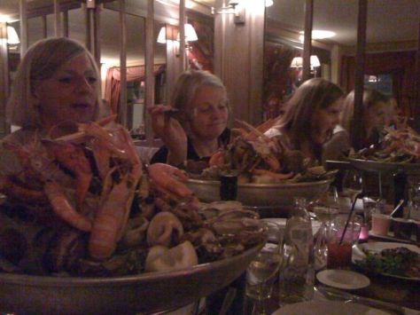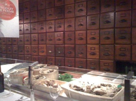 Hela gänget möts senare upp hos Karin för att dra vidare till La Quincaillerie (‘järnhandeln’) och middag. Superhärlig restaurang på tre små intrikata våningar med gamla järn- och trätrappor emellan. Mycket av den gamla inredningen från när stället huserade en järnhandel finns kvar, bland annat mängder av trälådor på väggarna vid entrén. Där det en gång i tiden stod gubbar (och kanske gummor?) och sorterade muttrar och skruvar tronar nu mängder av ostron. Vi smaskade skaldjursplatå (förutom höggravida Sandra) och jag avslutade med en riktigt god crème brulée!